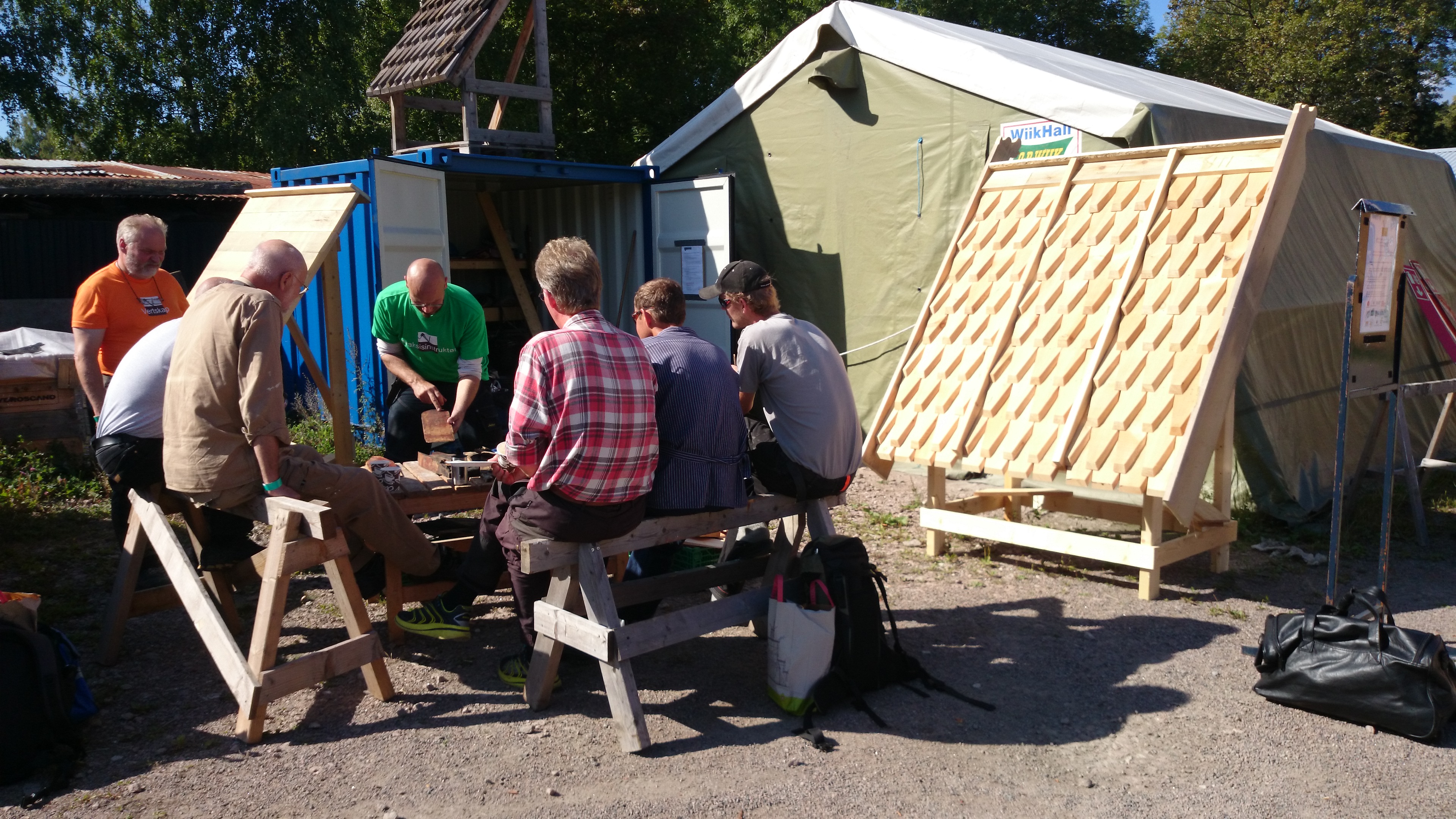 Forsøk og erfaringsutveksling rundt ulike festemetoder og tjærebreeing av kirketak. To prøvetak smøres ut fra ulike variabler. Diskusjon på Stavkirke fra Gol.