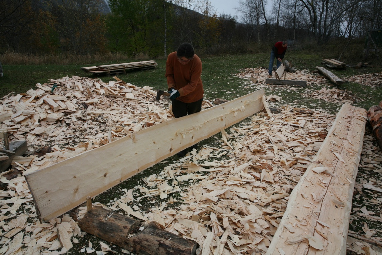I samband med restaurering av taket på Gildeskål gamle kyrkje vart det kløyvd og hogd til nye takbord. Her vert takborda hogd til på begge sider med glepphoggarøks. Foto: Roald Renmælmo