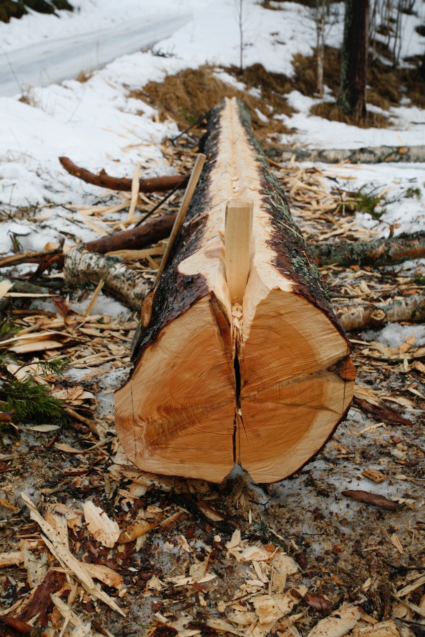 Kraftig furustokk som er under kløyving. Stokken er aska (det er hogd eit v-forma spor langsetter) på to sider og ein har starta å slå inn kilar. Foto: Siv Holmin